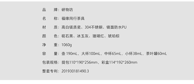 配置參數:彩盒X1, 便攜旅行包X1,旅行茶葉罐X1,陶瓷茶盤X1, 陶瓷茶壺X1,陶瓷杯X3